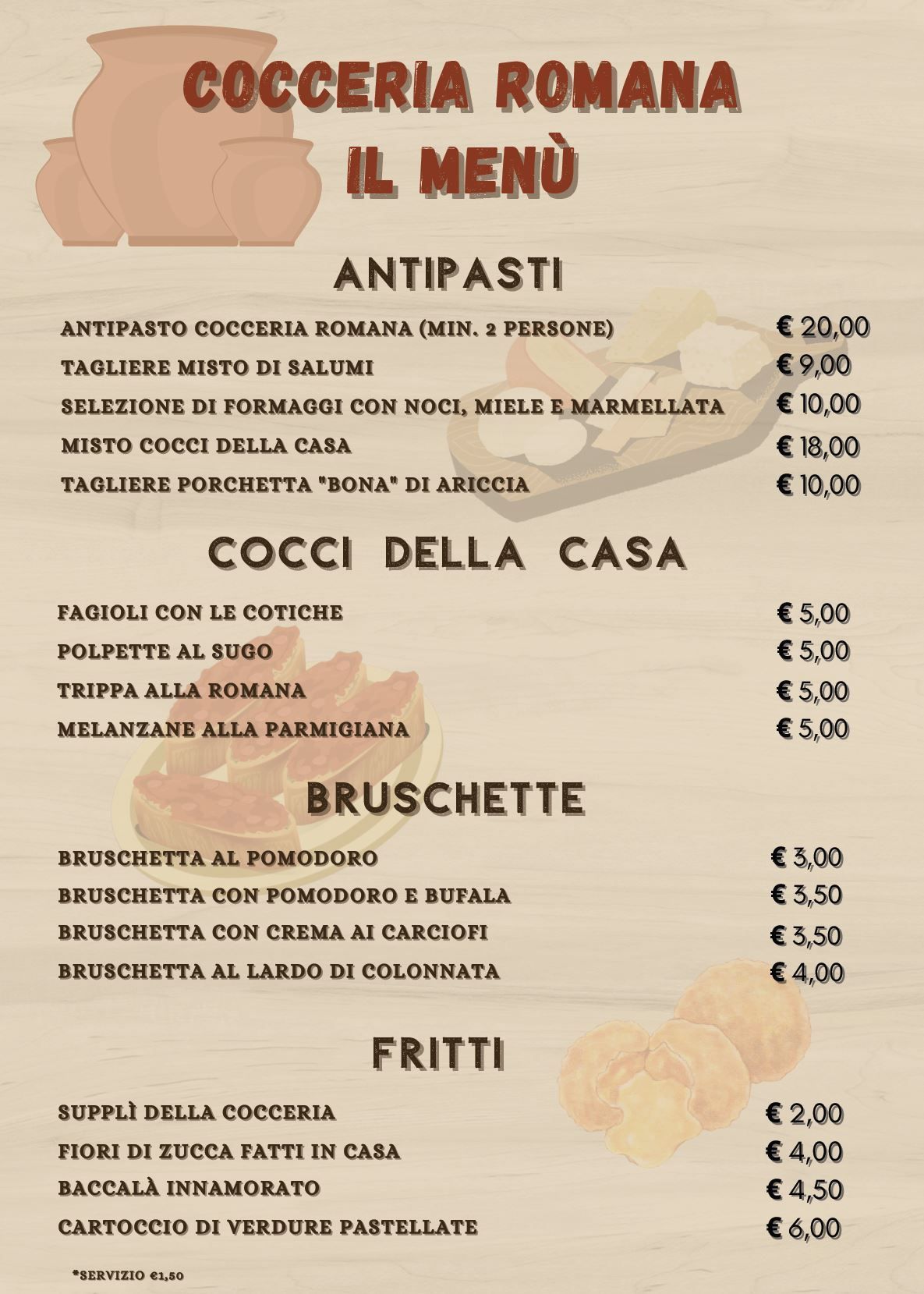 Il menu del ristorante comprende pietanze preparate con ingredienti genuini e accuratamente selezionati: dagli squisiti piatti fritti ai primi della tradizione romana, come i bucatini all'amatriciana o i tonnarelli cacio e pepe, passando per meravigliosi secondi di pesce e carne, tra cui grigliate di carne realizzate con tagli pregiati.
