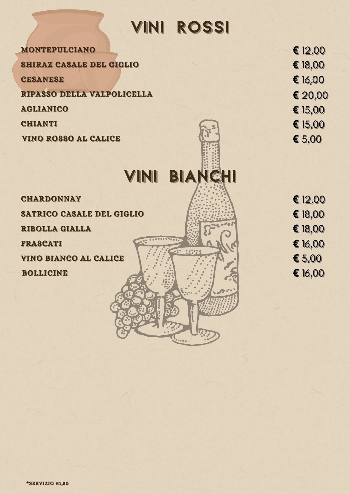 Vini bianchi e rossi leggeri e fragranti, bollicine per i brindisi con gli amici, vini rossi dal gusto deciso, per veri intenditori: queste solo alcune delle opzioni che puoi trovare nella nostra trattoria tipica romana.